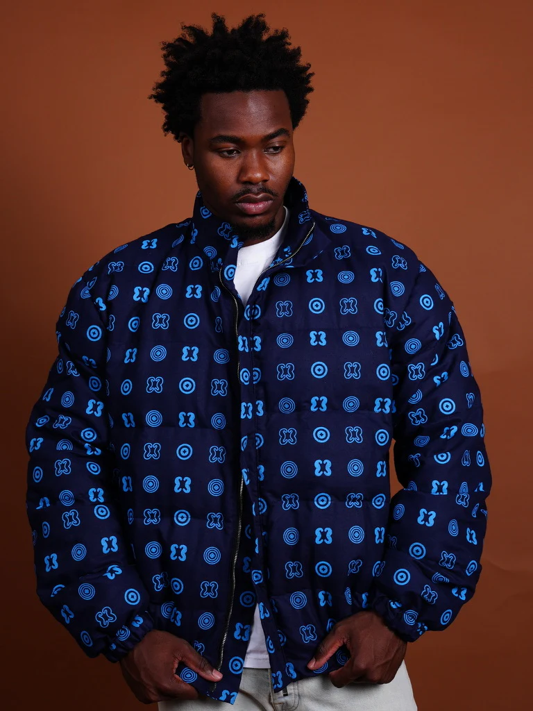 Hand Screen-Print Puffer Jacket in Blue