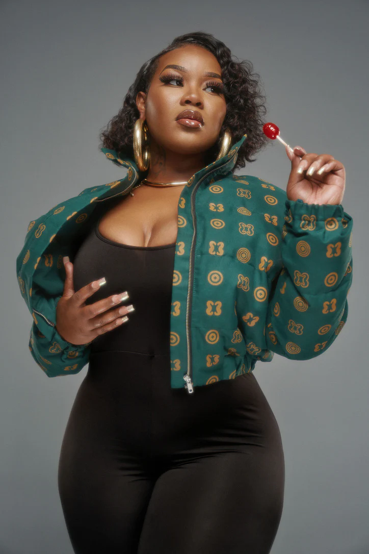 Hand Screen-Print Puffer Jacket in Green Cropped